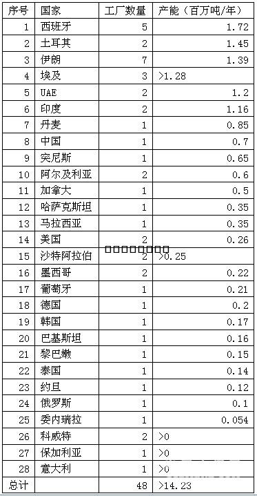 白水泥是一種可以替代灰水泥的增值產(chǎn)品,其熱反射性能和更美的外觀都優(yōu)于灰水泥。白水泥的生產(chǎn)方式與灰水泥相似,但是石灰石原料中氧化鐵和硫酸鐵含量要盡可能低。每增加0.1%的氧化鐵,將降低2.5%的熱反射率,并將產(chǎn)生顏色較暗的水泥。礦化劑和高溫可以確保氧化鐵缺乏的情況下原料的充分反應(yīng),而這需要更多的燃料。此外,白水泥熟料必須迅速冷卻,經(jīng)常用的冷卻方法是水冷卻,以防微量鐵雜志氧化使水泥顏色變深。這些因素使得白水泥生產(chǎn)成本更高。 炎熱氣候的國家白水泥的需求量比較高,與標準灰色混凝土相比白色混凝土表面可以反映出更多熱量。在發(fā)達經(jīng)濟體,白水泥越來越受歡迎,它經(jīng)常用于創(chuàng)新型建筑和標志性建筑的建設(shè)。作為一種增值產(chǎn)品,其出口距離要更遠一些,這就意味著產(chǎn)量不受國內(nèi)需求量的制約。2015年,世界上最大的白水泥生產(chǎn)國是西班牙,白水泥生產(chǎn)線有5條,產(chǎn)能合計172萬噸/年。土耳其、伊朗、埃及、阿聯(lián)酋和印度白水泥產(chǎn)能也超過100萬噸/年。 表1:全球各國白水泥產(chǎn)能情況