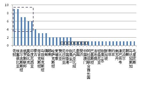 數(shù)據(jù)來源:商務部,中國水泥網(wǎng),中國水泥研究院 圖2:中國境外投資企業(yè)(水泥生產(chǎn)銷售業(yè)務)數(shù)量(按國家)
