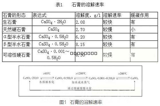 石膏的形態(tài)通常有生石膏(CaSO4·2H2O)、天然硬石膏(CaSO4)、半水石膏(CaS O4·0.5H2O)、可溶性硬石膏(CaSO4),其溶解度見表1。由表1可見,天然硬石膏和生石膏的溶解度相近,可溶性硬石膏和半水石膏的溶解度相近。但是,它們的溶解速率有很大的差別,半水石膏溶解速率快,天然硬石膏比生石膏的溶解速率慢得多,可溶性硬石膏是用生石膏或半水石膏有控制地脫水制成的,溶解速率慢。因此它們之間的匹配也影響水泥的流變性能?;钚愿叩腃3A溶解快,水泥中早期Ca2+和的水平高,所用的石膏中應(yīng)有適量溶解速率快的組分;活性低的C3A溶解較慢,水泥中的Ca2+和不應(yīng)在早期就消耗完,應(yīng)當(dāng)在后期還有一定的水平,故所用的石膏中應(yīng)有適量溶解速率慢的組分(表1、圖l)。
