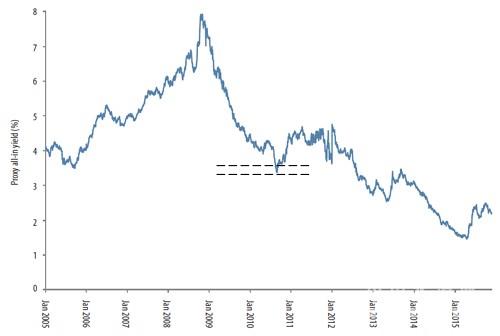數(shù)據(jù)來源:FactSet,RBS analysis 其次,通過實(shí)施縮減成本和其他自助措施,水泥行業(yè)已經(jīng)實(shí)現(xiàn)了一定量的成本節(jié)約,進(jìn)一步的節(jié)約成本將更加艱難。事實(shí)上,那些通過實(shí)施增效方案實(shí)現(xiàn)最好效果的企業(yè)都是因地制宜的在企業(yè)內(nèi)部實(shí)施成本節(jié)約方案。整合為水泥企業(yè)提供了協(xié)同發(fā)展的能力,最終在供過于求的市場(chǎng)中形成合理的產(chǎn)能。 第三,一些大型水泥企業(yè)在金融危機(jī)爆發(fā)后已經(jīng)成功降低了杠桿率,這給他們的資產(chǎn)負(fù)債表增加了靈活性以承擔(dān)債務(wù)融資收購(gòu)。事實(shí)上,銀行和債務(wù)資本市場(chǎng)對(duì)于大型水泥企業(yè)進(jìn)行并購(gòu)?fù)顿Y的資金借貸的增長(zhǎng)是持支持態(tài)度的,在貸款利率較低的環(huán)境下,水泥企業(yè)可以以歷史較低水平的資本進(jìn)行投資,如圖3。 圖3:對(duì)歐洲投資級(jí)企業(yè)債券融資的代理成本(7年或10年平均值)