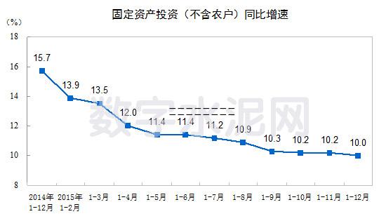 2015年,全國(guó)固定資產(chǎn)投資(不含農(nóng)戶)551,590億元,比上年名義增長(zhǎng)10%(扣除價(jià)格因素,實(shí)際增長(zhǎng)12%),增速比1-11月份回落0.2個(gè)百分點(diǎn)。從環(huán)比速度看,12月份固定資產(chǎn)投資(不含農(nóng)戶)增長(zhǎng)0.68%。