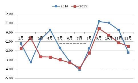 數(shù)據(jù)來源:中國水泥研究院 從各月份的表現(xiàn)看,2015年各月份的價格行情普遍弱于2014年同期。例如,2014年3月份水泥價格跌幅縮窄,4月份則出現(xiàn)了小幅反彈,而2015年由于市場啟動緩慢,3~7月份水泥價格跌幅不僅沒有縮窄的跡象,反而逐月加大,同時更沒有出現(xiàn)預(yù)期的小旺季,9月傳統(tǒng)旺季來臨時反彈同樣不及2014年同期,10月雨水及高庫存使得價格重新回歸跌勢,11、12月價格更是早早敗退。 圖4:2014與2015年各月份價格指數(shù)變動幅度走勢(%)