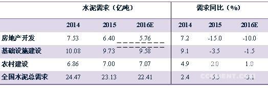 數(shù)據(jù)來源:國家統(tǒng)計局、中國水泥研究院 各區(qū)域行業(yè)綜合噸利潤全面下滑,華北已嚴(yán)重虧損,東北、西北及西南也處于虧損邊緣,形勢十分嚴(yán)峻,華東及中南地區(qū)成為全國主要的利潤貢獻點,噸利潤水平也已腰斬。 四、2016年行業(yè)展望:供求矛盾加劇 整體效益將承壓 4.1、供需基本面:需求繼續(xù)弱勢,供給側(cè)有待落實 2015年底召開的中央經(jīng)濟工作會議,對“十三五”開局之年的經(jīng)濟工作進行了全面部署,強調(diào)要著力推進供給側(cè)結(jié)構(gòu)性改革,推動經(jīng)濟持續(xù)健康發(fā)展。2016年中國經(jīng)濟結(jié)構(gòu)性下滑將會繼續(xù),多家機構(gòu)預(yù)測經(jīng)濟增速將降至6.8%、6.6%,甚至更低。去產(chǎn)能、去庫存、去杠桿意味著制造業(yè)與房地產(chǎn)投資將進一步下降,而基礎(chǔ)設(shè)施投資以及消費與新興服務(wù)業(yè)只能抵消部分影響。中國經(jīng)濟增長對投資依賴程度以及能源、資源密集度正在下降,據(jù)預(yù)計2016年固定資產(chǎn)投資增速將下8%-9%。與水泥需求密切相關(guān)的兩大領(lǐng)域,房地產(chǎn)、基建投資增速繼續(xù)雙雙回落,地產(chǎn)投資在2016年將首度負(fù)增長,預(yù)計降幅在2%-3%左右,基建投資在各項穩(wěn)增長措施支持下,增速小幅滑落至15%-18%。 房地產(chǎn)開工制約疊加基建水泥需求的弱彈性決定了 2016 年水泥需求難有顯著改善。據(jù)中國水泥研究院測算,2016年全國水泥需求繼續(xù)下滑態(tài)勢,預(yù)計全年同比縮減3.1%。需求增長的最大制約依然是房地產(chǎn)端,預(yù)計房地產(chǎn)水泥需求再次同比下滑10%,但降幅較上年明顯收窄;2015年仍有眾多基建項目未落地,2016年將積極推進,加之在中央“三去一補一降”之下,基建投資及項目開展成為維持經(jīng)濟增長的基石,基建端水泥消費成為年內(nèi)水泥需求的一個最大變量。農(nóng)村投資建設(shè)方面也將有所減緩,但農(nóng)村水泥需求依然維持正增長勢頭。 表4:2014-2016年各板塊水泥需求表現(xiàn)