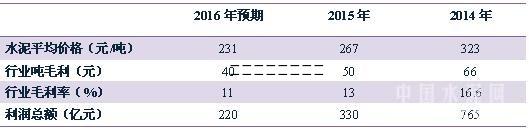 數(shù)據(jù)來源:中國水泥研究院 在淘汰產(chǎn)能方面,隨著供給側(cè)改革去產(chǎn)能任務(wù)的落實,缺乏市場競爭力的產(chǎn)能將加快出清。在國家去產(chǎn)能從煤炭、鋼鐵入手之后,2016年水泥行業(yè)去產(chǎn)能也已箭在弦上。水泥去產(chǎn)能,首先,需嚴(yán)控總量。禁止什么形式的新增產(chǎn)能,包括等量或減量淘汰置換、異地置換、技術(shù)改造擴能等。其次,壓縮存量。通過提高環(huán)保、能耗、安全、生產(chǎn)等標(biāo)準(zhǔn),加大產(chǎn)能淘汰力度,優(yōu)化行業(yè)供給結(jié)構(gòu)。面對目前全國2500t/d以下熟料生產(chǎn)線共有323條,合計產(chǎn)能1.52億噸,約占熟料總產(chǎn)能的8.5%。在市場倒逼和政策推動,這部分產(chǎn)能首當(dāng)其沖遭出清。此外,2500t/d~3000t/d(不含3000t/d)熟料生產(chǎn)線產(chǎn)能4.23億噸,占比接近23%,這部分產(chǎn)能在行業(yè)需求收縮趨勢下也將成為去產(chǎn)能的重點對象。此外,自2015年12月1日期正式取消32.5復(fù)合硅酸鹽水泥,小型粉磨站主要以生產(chǎn)32.5 標(biāo)號水泥為主,該標(biāo)號的取消也有利于將大量過剩的小粉磨產(chǎn)能淘汰,進一步改善行業(yè)的供給結(jié)構(gòu)。最后,鼓勵企業(yè)重組和產(chǎn)業(yè)鏈整合。在行業(yè)下行周期中,企業(yè)加快聯(lián)合重組、資源整合,改善布局結(jié)構(gòu)不合理,提升行業(yè)集中度。 4.2、行業(yè)效益預(yù)判:盈利將繼續(xù)承壓萎縮 2016年在需求端情勢繼續(xù)惡化,供給端難有實質(zhì)性控制之下,行業(yè)景氣度將繼續(xù)下滑。但好在行業(yè)經(jīng)過2015年超預(yù)期“不景氣”運行之后,業(yè)內(nèi)企業(yè)已有一定適應(yīng)心理。預(yù)計2016年上半年價格趨弱下行,下半年依基建項目啟動有反彈表現(xiàn),總體較2015年再下降13%左右。2016年煤炭行業(yè)仍然持續(xù)低迷,動力煤價格在上年已跌去20%之下或?qū)⒃傧滦?5%。經(jīng)綜合測算,2016年行業(yè)的噸毛利將縮至40元,降幅較上年收窄,同時,行業(yè)毛利率也將將至11%左右,約較2015年低2個百分點,行業(yè)全年效益縮水至220億元水平。 表6:2016年水泥行業(yè)效益相關(guān)主要指標(biāo)預(yù)期