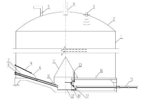 附圖一 大型粉煤灰鋼板庫結(jié)構(gòu)原理圖 1—庫體;2—庫頂;3—料位計(jì);4—入料管;5—安全閥;6—導(dǎo)料錐; 7—環(huán)形內(nèi)區(qū)流化棒及卸料管;8—環(huán)形外區(qū)流化棒及卸料管;9—破拱流化棒;10—料封管;11—封閉減壓錐(均化室);12—中心區(qū)流化棒;13—垂直下料管;14—發(fā)送器;15—出料管道;16—廊道;17—人孔及觀察孔 。 1.2出料原理 在大型粉煤灰儲庫底部中心建有一錐形封閉減壓錐,在減壓錐底部配置物料活化氣力裝置(帶料可抽出流化棒),側(cè)板配置物料發(fā)送器,頂部配置垂直卸料管。庫底板與水平面程17°的卸料傾角,根據(jù)庫體直徑不同可分為50個(gè)以上的充氣區(qū)。卸料充氣區(qū)分外環(huán)充氣區(qū)和內(nèi)環(huán)充氣區(qū),并在外區(qū)兩相鄰導(dǎo)料槽間設(shè)置導(dǎo)料錐,構(gòu)成V型卸料單元。當(dāng)輪流向某一充氣區(qū)送入羅茨風(fēng)機(jī)氣體時(shí),該區(qū)物料呈流態(tài)化,并通過導(dǎo)料管流入中心區(qū)減壓錐中,進(jìn)入減壓錐的物料經(jīng)充氣攪拌成為活化物料,具有較好的流動性,經(jīng)發(fā)送器的集料、射流作用,進(jìn)入輸送管道內(nèi),完成鋼板庫的出料。 1.3 大型粉煤灰儲庫的出庫輸送工藝方式 用斜槽或氣力輸送管道將物料送入提升機(jī),再經(jīng)斜槽送入汽車散裝庫或配料倉。 附圖二:
