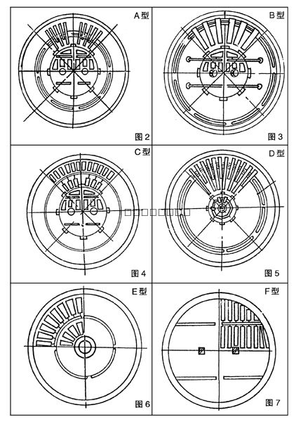 充氣箱在庫內(nèi)排列時(shí),原則上要求實(shí)際排列面積占總面積越大越好,攪拌庫和混合式均化庫中心區(qū)(攪拌區(qū)),對這點(diǎn)要求更為重要。現(xiàn)提供A、B、C、D、E、F六種基本排列形式供選用。 A型和B型排列適用于φ12m以下的水泥或生料混合式均化庫,環(huán)形區(qū)充氣箱向中心區(qū)傾斜安裝,中心區(qū)充氣箱水平安裝。 C型排列(見圖3)適用于φ12m以上的水泥或混合式均化庫,環(huán)形區(qū)充氣箱向中心區(qū)傾斜安裝,申心區(qū)充氣箱水平安裝。 D型排列(見圖4)適用于各種規(guī)格的水泥或生料儲(chǔ)存庫,環(huán)形區(qū)充氣箱向中心區(qū)傾斜安裝,中心區(qū)充氣箱水平安裝,但中心區(qū)較小。 E型排列(見圖5)適用于各種規(guī)格的水泥或生料儲(chǔ)存庫和攪拌庫,環(huán)形區(qū)充氣箱向中心傾斜安裝,中心區(qū)充氣箱水平安裝。 F型排列(見圖6)適用于各神規(guī)格的水泥或生料攪拌庫,所有充氣箱水平安裝。 以上六種基本排列各有其優(yōu)缺點(diǎn)及適應(yīng)范圍,設(shè)計(jì)和使用部門可按實(shí)際情況進(jìn)行選用。充氣箱的分區(qū)數(shù)量,可按實(shí)際情況進(jìn)行,但必須符合四區(qū)、六區(qū)、八區(qū)、十二區(qū)的規(guī)定,充氣箱斜度亦可根據(jù)具體情況選定,建議在6°~26°范圍內(nèi)選擇 2、羅茨風(fēng)機(jī) 羅茨風(fēng)機(jī)是空氣均化的主要?dú)庠矗ㄖ皇褂昧_茨風(fēng)機(jī)。不使用空壓機(jī),節(jié)約投資,降低耗電量,同時(shí)有效地防止空壓機(jī)氣力源水分進(jìn)入水泥鋼板倉中,防止水泥板結(jié),提高了水泥質(zhì)量)風(fēng)壓為0.07Mpa,風(fēng)量具體由現(xiàn)場工藝來定。例如: