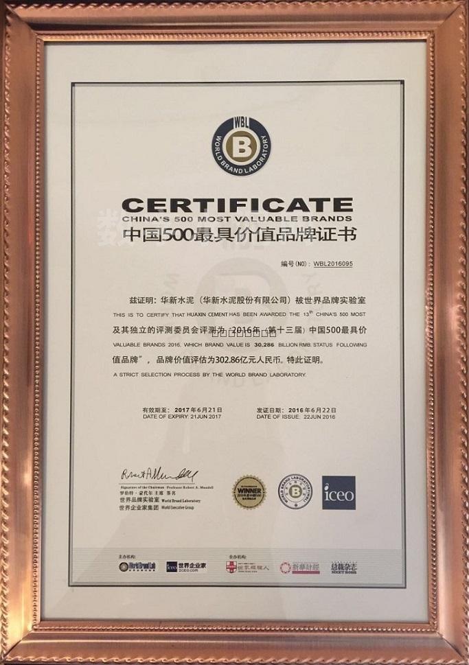 由世界品牌實驗室主辦的“世界品牌大會”于6月22日在北京舉行,會上發(fā)布了2016年(第十三屆)《中國500最具價值品牌》分析報告。華新水泥以302.86億元的品牌價值榮登排行榜第95位,品牌價值較去年增加50.1億元,排名較去年提升1位。