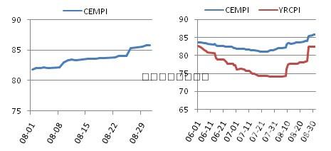 一、全國與區(qū)域行情綜述 1.1 全國行情:區(qū)域穩(wěn)增長調(diào)結(jié)構(gòu)會議后水泥價格上漲明顯 8月初西南地區(qū)水泥穩(wěn)增長調(diào)結(jié)構(gòu)增效益市場論壇在貴陽召開,繼西北、黃河流域及新疆地區(qū)之后又一個區(qū)域加入企業(yè)統(tǒng)一推漲價格保障效益的行列。8月份全國水泥價格明顯回升,截止到8月底,中國水泥價格指數(shù)(CEMPI)為85.8,月環(huán)比上漲4.27個點,是今年以來漲幅最大的月份。拉動全國水泥價格明顯回升的主要力量仍然是長江流域,8月份長江流域水泥價格指數(shù)上漲8個點。 圖1:8月CEMPI走勢及近三個月CEMPI&YRCPI走勢