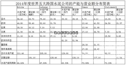 表2 2014年度世界五大水泥跨國(guó)水泥公司的產(chǎn)能與營(yíng)業(yè)額分布簡(jiǎn)表